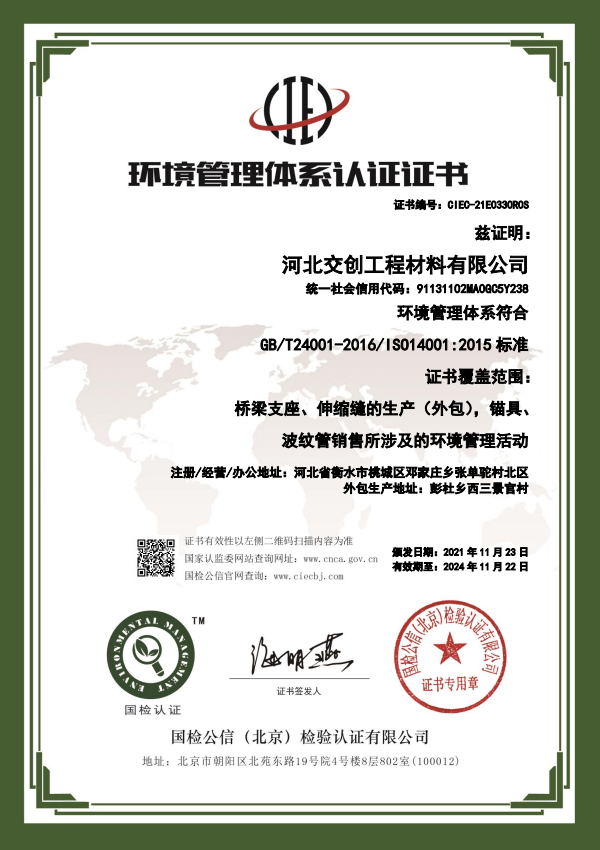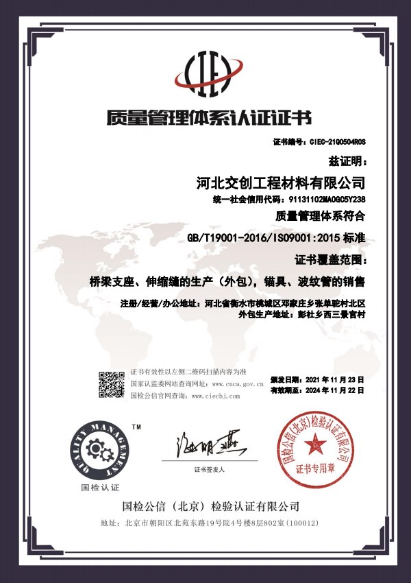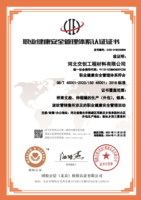 公司资质qualifications 公司资质 公司简介 联系我们 推荐产品 1防落梁装置 2防落梁装置 3钢波纹涵管 4铅芯隔震支座 5高阻尼橡胶支座 6板式橡胶支座 7桥梁伸缩缝F型 8毛勒式桥梁伸缩缝 职业健康安全管理体系认证证书质量管理体系认证证书环境管理体系认证证书